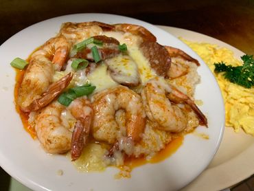 GRITS BLENDED WITH CAJUN GARLIC BUTTER, WHITE CHEDDAR CHEESE BLEND, TOPPED WITH GREEN ONIONS, PORK ANDOUILLE SAUSAGE, 4 LARGE CAJUN SHRIMP AND MO' CHEESE! SERVED WITH 3 LARGE EGGS AND A FRESH DROP BISCUIT!